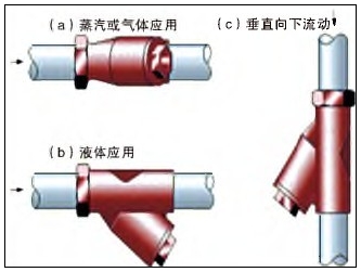 在蒸汽体系中,一般遍及选用Y型过滤器,本体为紧凑圆柱形,健壮耐高压;当用于高压场合时,阀体原料一般选用铬钼钢。Y型过滤器在蒸汽和气体体系中要求水平装置,过滤室和管道处于同一平面上(见图a),这样能够防止水积累在过滤室中,以免引起腐蚀并影响热量传递。